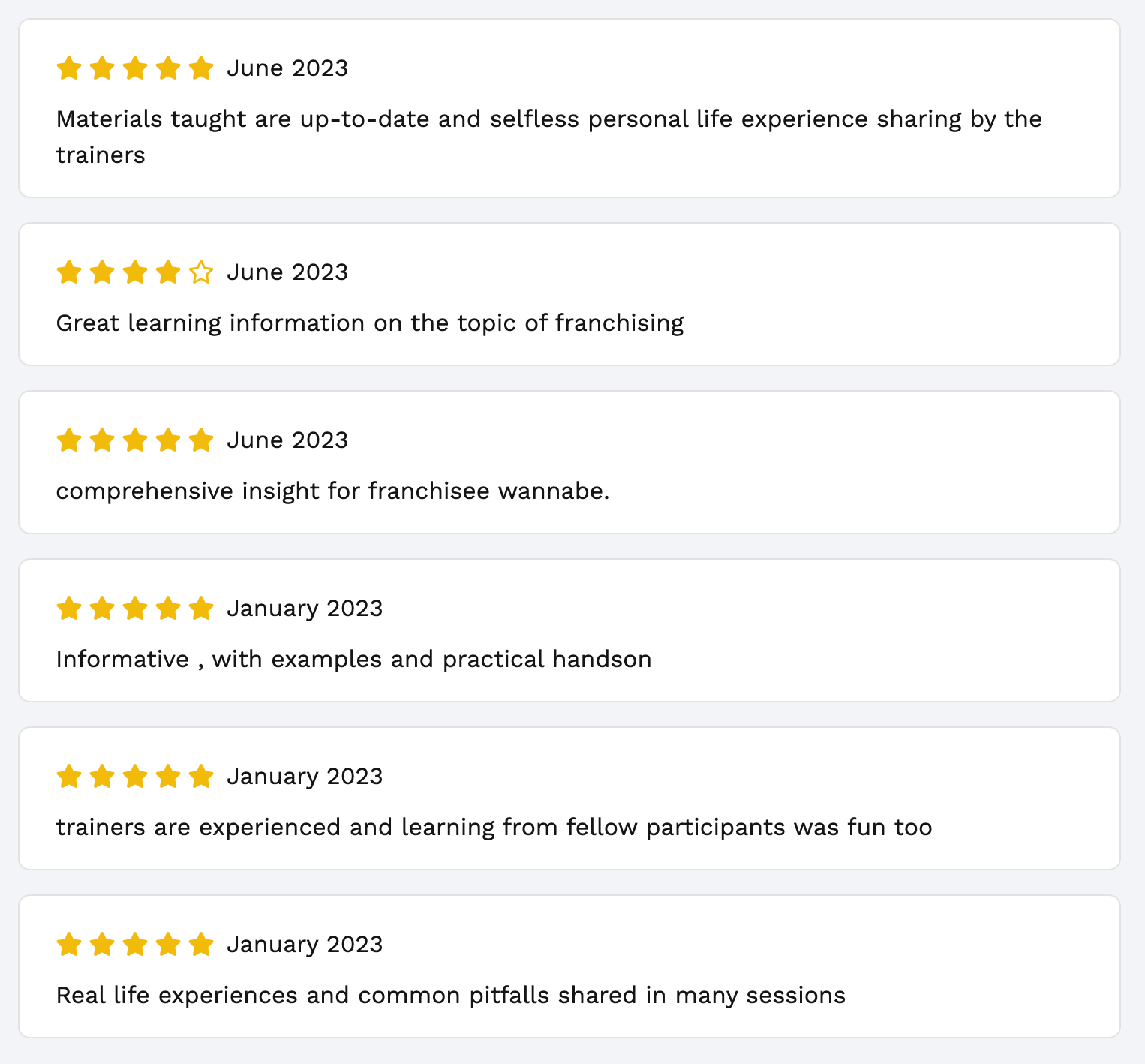 We invite you to join our WSQ FBO course for hands‑on guidance tailored to franchise business owners: This course covers essential topics, provides expert-led instruction, and offers valuable networking opportunities with established leaders in the franchise community. Register today to gain the knowledge and confidence you need to move forward.