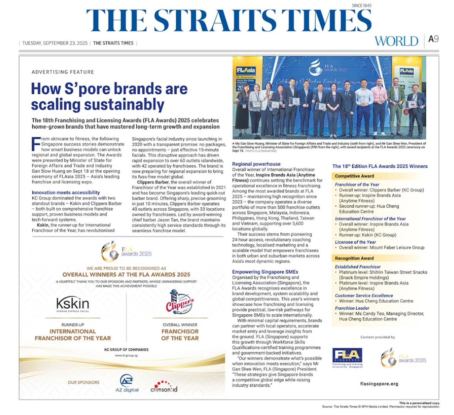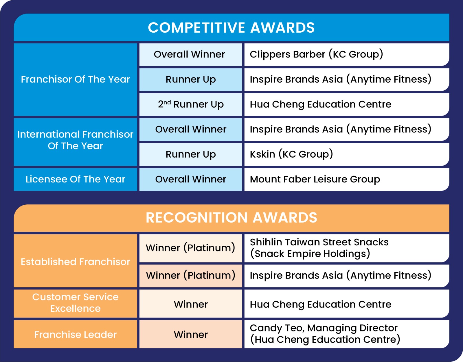 The Franchising & Licensing Awards (FLA Awards), initiated in 2005 by the Franchising and Licensing Association (Singapore), celebrate outstanding achievers in the local industry. Now in its 18th edition, the FLA Awards offer a prestigious platform for showcasing successful franchise concepts and businesses on an international stage. Serving as a national benchmark, the awards inspire franchise concepts to aim higher, with over 350 brands benefiting since its inception. These awards are a badge of honor in the industry, instilling confidence and demonstrating local brands' global competitiveness. Winners' of the past edition (FLA Awards 2023) includes 7-Eleven, JUMBO Seafood, Inspire Brands Asia (Anytime Fitness), Subway, OldTown, Gopizza, Hovi Care, etc