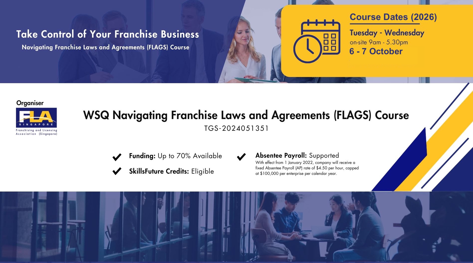 Join FLA’s WSQ Navigating Franchise Laws and Agreements course to gain the skills needed to draft, negotiate, and manage franchise agreements that protect your business and foster growth.